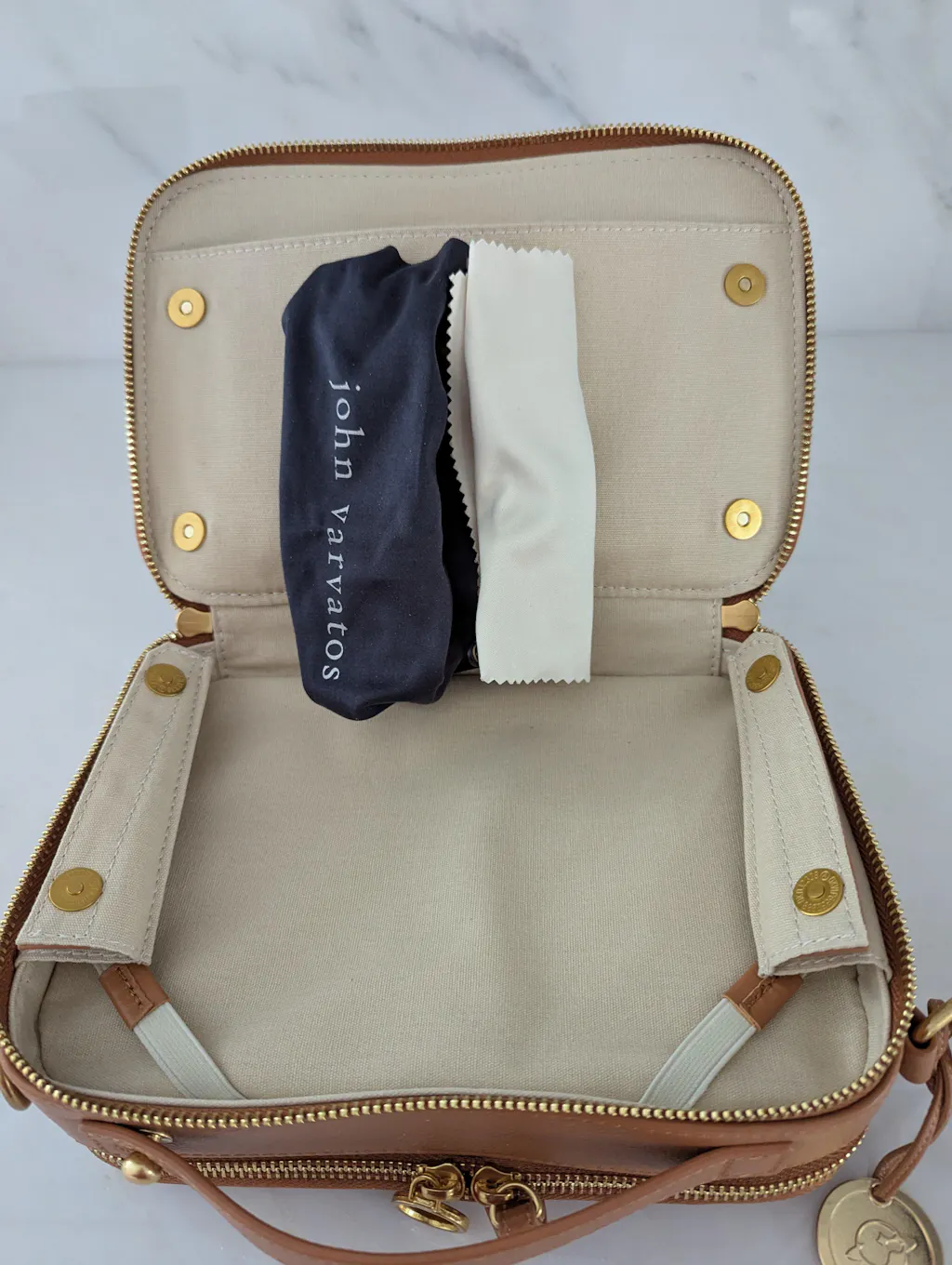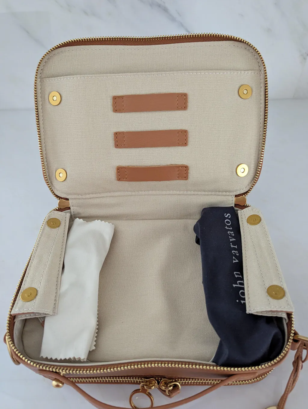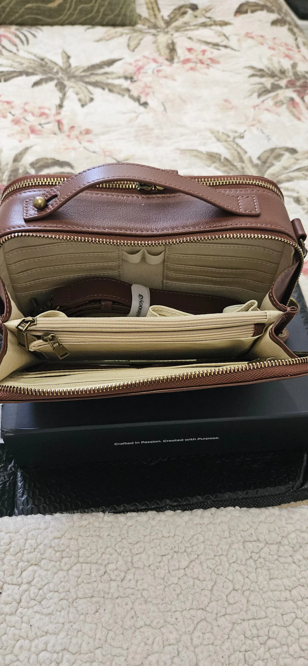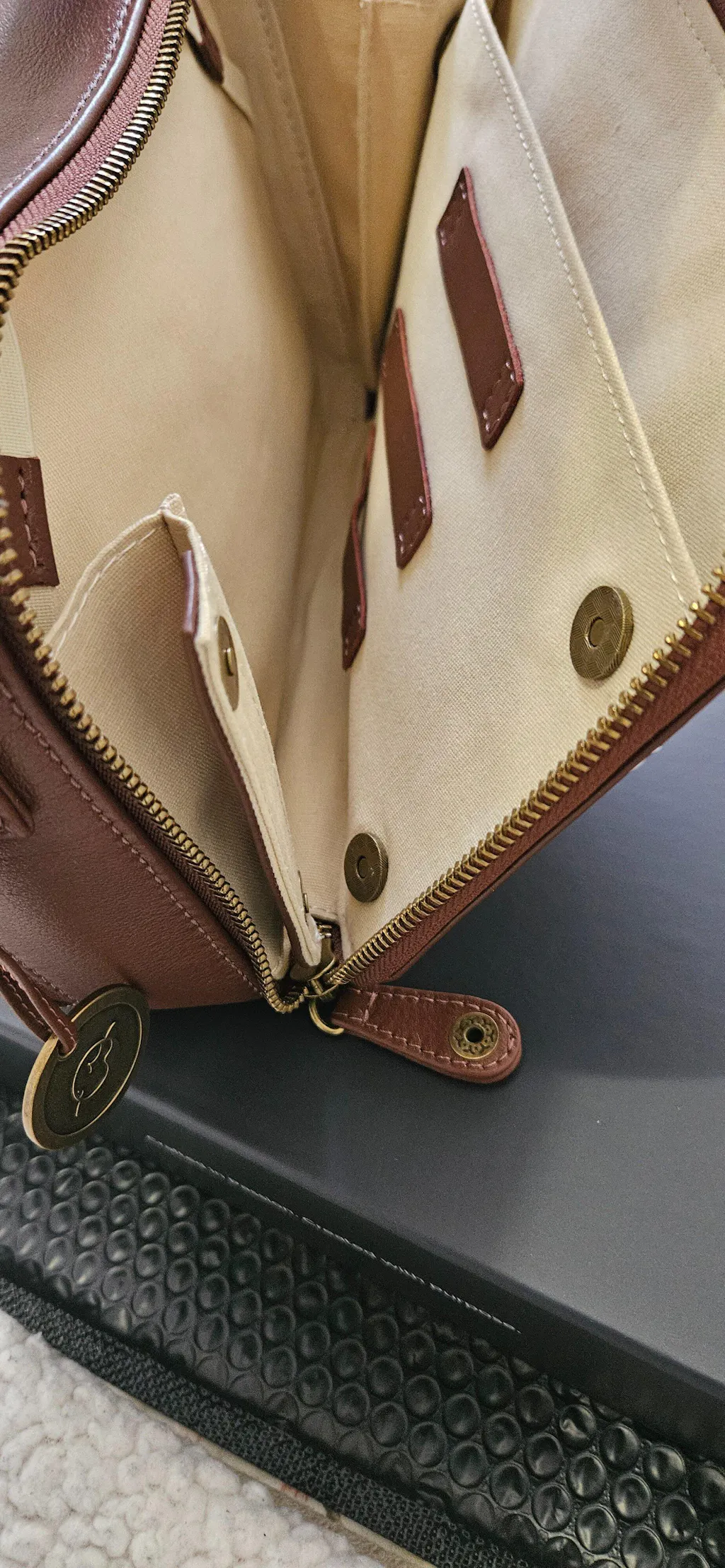 The front of the bag has an external pocket with a metal magnetic closure, the main front pocket is with 3 large pockets with metal zippers and 2 small pockets, 16 card slots (including 2 clear ID card slots) 2 pen slots and 1 retractable key fob.
