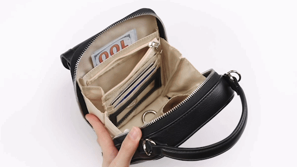 No longer need to carry wallet!The bag features built-in card slots, zippered pockets, and compartments that keep your cards, cash, and coins neatly organized.You can easily see and access what you need while shopping,cutting fumbling time.
