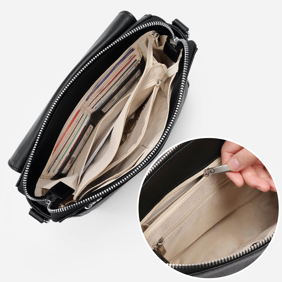 Thoughtfully designed built-in wallet compartments keep your cards, cash, and coins neatly organized. The hidden zip pocket provides discreet protection for your valuables, while the RFID-blocking lining safeguards your credit cards and IDs from digital theft wherever you go.