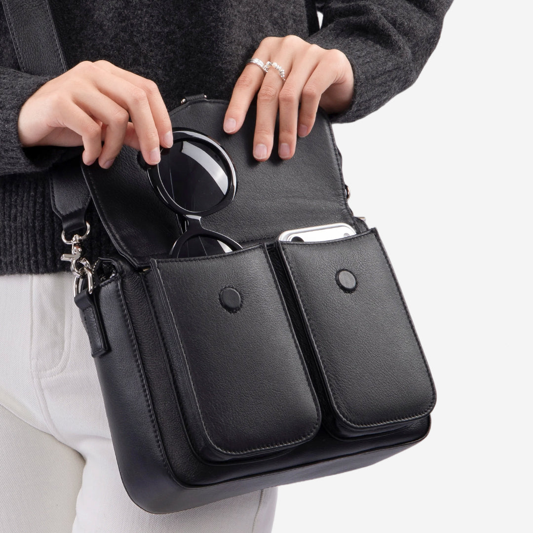 Two independent exterior glasses pockets feature a reinforced front panel and a soft microfiber lining. The separated design keeps your glasses from rubbing against other items. They’re spacious enough to fit larger glasses, and the magnetic closure allows quick and easy access. When not used for eyewear, the extra pocket serves as convenient storage for your phone or daily essentials.