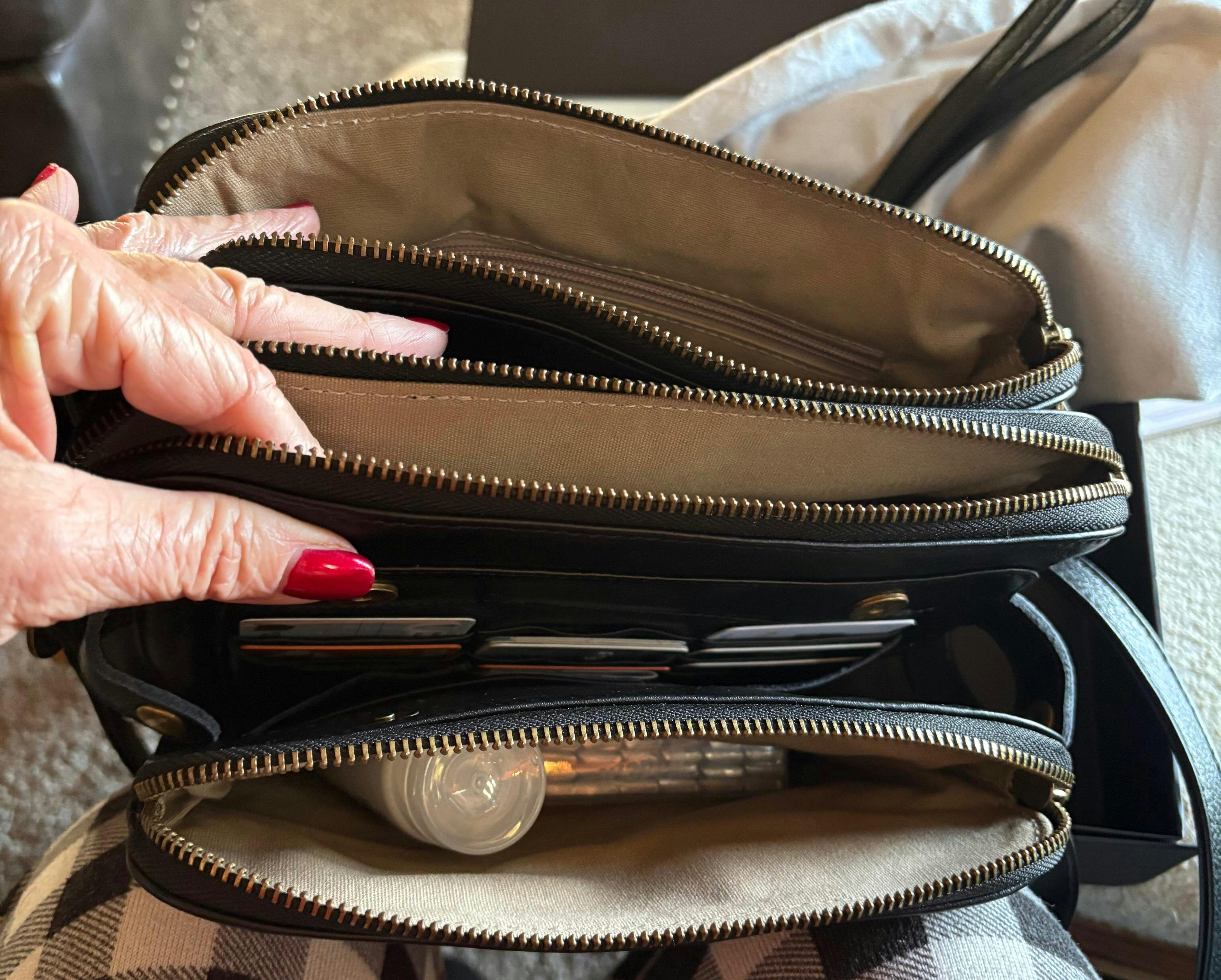 This leather bag is lightweight in appearance, yet large in capacity. Perfect for carrying your iPad mini, wallet, keys, cell phone, perfume, umbrella, sunglasses, cosmetics, scarf, and other daily essentials. Strong magnetic snaps plus external snaps on both sides for double protection, multiple card slots and bill positions, zippered insert pockets, multiple independent compartments to meet your daily travel needs.